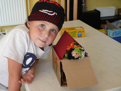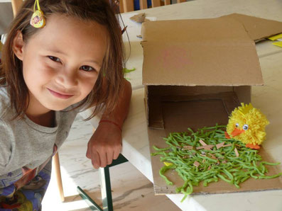 Das ist Rekord! Drei Bommeltiere! Diesmal ein Küken, für das es sogar noch ein Haus mit Wiese und leckeren Würmern gibt. Und wenn wir noch mehr Zeit gehabt hätten, wäre daraus wohl ein ganzer Hühnerstall geworden! So wurde auch der Karton verwendet, der noch übrig war.