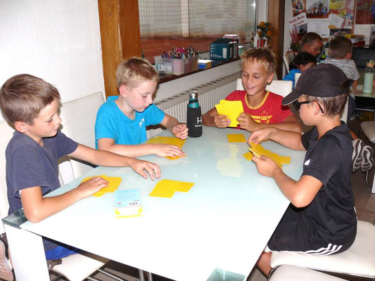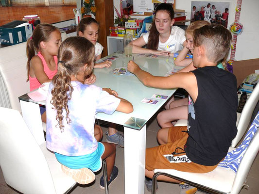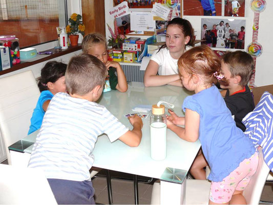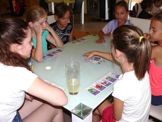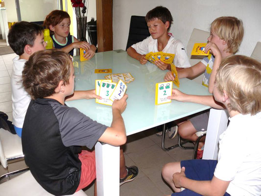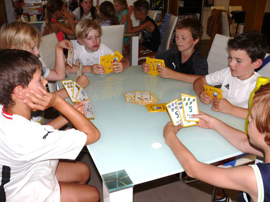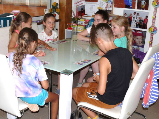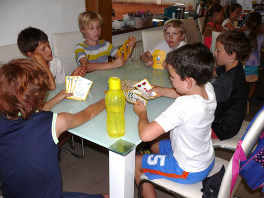 Um Langeweile großräumig zu verhindern, wurde auf Methodenvielfalt großen Wert gelegt. So wechselten die Aktivitäten zwischen Spielen mit Karten und Würfeln, Wortschatzarbeit mit Bildkarten aller Art, Arbeitsblättern zur Festigung des Erarbeiteten und kreativen Phasen, in denen die Kinder meist mit Stiften und Papier ihrem Schaffensdrang freien Lauf lassen konnten. Wer Anregungen oder sanfte Anleitungen brauchte, konnte auch ein Pool von Materialien zugreifen. Aber mit zunehmendem Campverlauf sprudelten die eigenen Ideen immer ergiebiger.