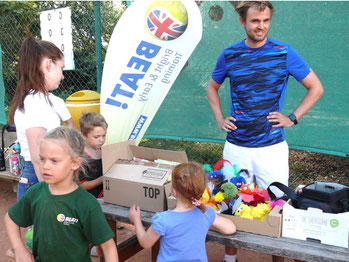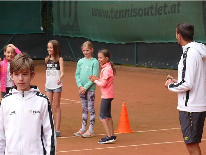 Wenn der Kopf rauchte, ging es wieder zurück auf den Tennisplatz. Auch hier wird bei BEAT! größten Wert darauf gelegt, dass das Training abwechslungsreich, ausgeglichen, aber trotzdem zielgerichtet ist. Es soll eine gute Motorik des gesamten Körpers gefördert werden. Gleichzeitig werden aber die Grundlagen technisch guten Tennisspiels gelegt. Dazu gehören auch gute Balance und trainierte Hand-Auge-Koordination,